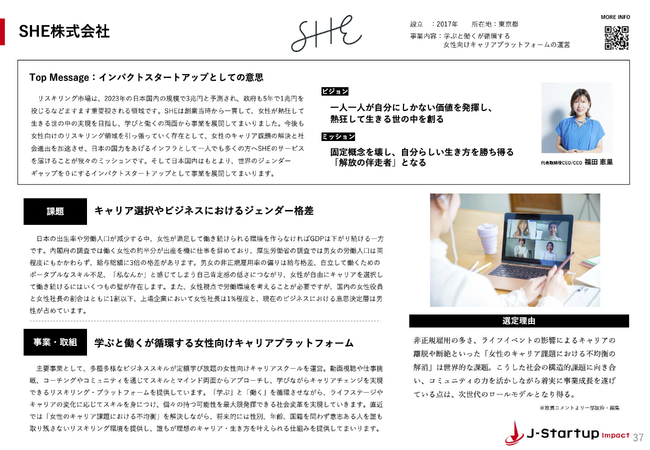 累計7万人以上が受講し、学ぶから働くまでをサポートする女性向けキャリアスクール「SHElikes(シーライクス)」を運営するSHE株式会社(所在地:東京都港区、代表取締役CEO:福田恵里、以下SHE)は、経済産業省が運営するインパクトスタートアップ育成支援プログラム「J-Startup Impact」に選定されましたことをお知らせいたします。