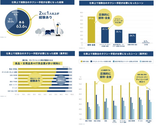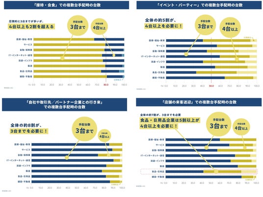 主なシーンは圧倒的に「接待・会食」で、それに「イベント・パーティーの来賓・来客」のための手配が続きます。展示会、カンファレンス等が開催される食品・日用品系企業や医療・福祉・教育系は他業界よりもイベント・パーティーでの複数台手配が求められるシーンが多い傾向でした。