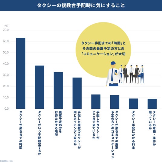 一度に複数台のタクシーを手配するのに最も気になるのは、「タクシーが来るまでの時間」。「乗車予定の方をおまたせする場所」も上位に上がる結果となりました。