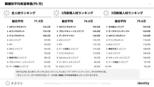 3月では2月と全人材ランキングにはランクインしていない「データサイエンティスト」が120万円で2位、「BIエンジニア」が110万円で5位とデータを扱う職種の平均希望単価が上がってきております。