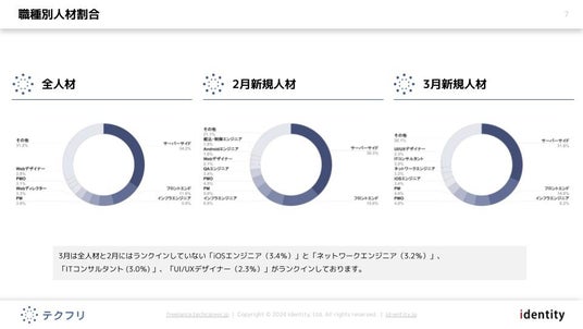 3月は全人材と2月にはランクインしていない「iOSエンジニア(3.4%)」と「ネットワークエンジニア(3.2%)」、「ITコンサルタント (3.0%) 」、「UI/UXデザイナー(2.3%)」がランクインしております。