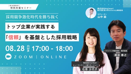 株式会社Hajimari(本社:東京都渋谷区、代表取締役:木村直人)は、8月28日(水)に信頼でつながる日本のキャリアSNS「YOUTRUST」を運営するYOUTRUST社 人事マネージャーの石原 沙代子氏と、日本の人事部「HRアワード2019」企業人事部門 個人の部最優秀賞を受賞されたソフトバンク社 執行役員の源田 泰之氏をお招きして、特別共催セミナーを開催することをお知らせいたします。
