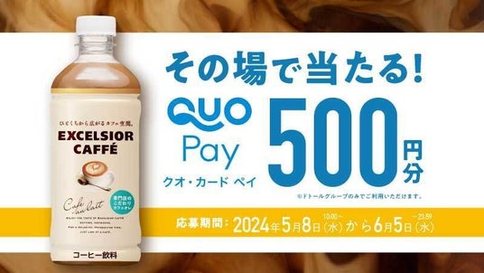 株式会社クオカード(以下当社、本社:東京都中央区、代表取締役社長:近田 剛)が展開するスマートフォンで使えるデジタルギフト『QUOカードPay(クオ・カード ペイ)』は、株式会社ドトールコーヒー(本社:東京都渋谷区、代表取締役社長:星野 正則)が5月8日(水)より開催する「その場で当たる!クオ・カード ペイ500円分キャンペーン」にて採用されました。本キャンペーンでは、対象の自販機で「エクセルシオール カフェ カフェオレ(500ml)」を買って応募すると、抽選で2,000名様にドトールグループ専用QUOカードPay500円分がその場でプレゼントされます。この機会にぜひキャンペーンに参加して、ドトールグループ専用QUOカードPayを手に入れてください。