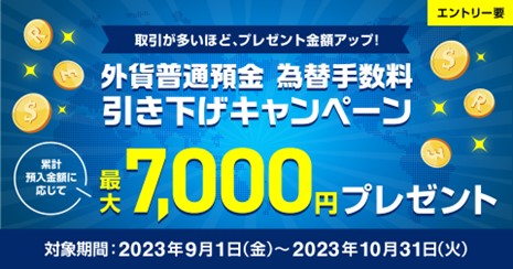 GMOあおぞらネット銀行株式会社(以下、当社)の外貨普通預金は、為替手数料を業界最低水準*で提供しており、8月1日(火)には、さらに為替手数料の引き下げを行いました。これを機に多くの方にご利用いただきたく、累計預入金額に応じて最大7,000円をプレゼントする新たなキャンペーンを2023年9月1日(金)より開始いたします。これに加えて、外貨普通預金のお取引がはじめてのお客さま向けの常設プログラムを利用すると、最大1万円がもらえるチャンスです。