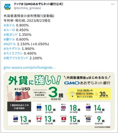 最新の外貨普通預金金利や外貨商品に関する情報を、公式SNS「テックま(@techma_gmoaoz)」でお知らせしています。