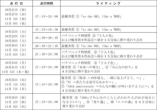 受賞10作品は、「あかりの日」である2022年10月21日(金)から11月9日(水)の期間(10月28日を除く)に点灯