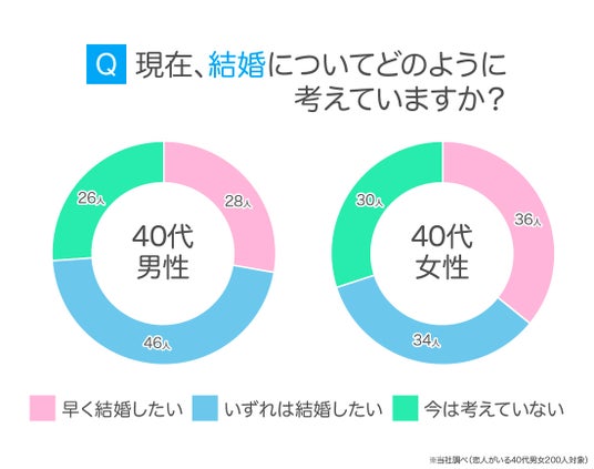 恋人がいる40代の成人男女200人に「現在、結婚についてどのように考えていますか?」と尋ねたところ、最多は「いずれは結婚したい」80人(40.00%)でした。