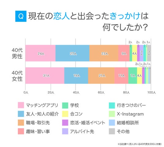 男女合計では200人中55人が「マッチングアプリ」と回答し、40代でも最多となりました。また、20代・30代と比べて「趣味・習い事」の割合が増加しており、共通の関心をきっかけとした出会いが一定数存在していることが分かりました。