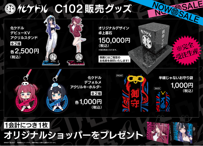 お名前をオーダーメイドで刻印し、自宅に置いておくことができるモバイルな墓石、『オーダーメイド墓石』や、デビューに伴い、成功祈願をメンバー全員で念じた『半端じゃないお守り袋』など、『化ケドル』の世界観を表したブースで、初のコミックマーケット出展に挑みます。
