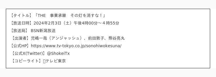 M&Aキャピタルパートナーズ株式会社(東京都中央区・代表取締役社長 中村悟)は、2月3日(土)16:00より、テレビ東京系列の新潟放送で放映される「THE 事業承継 その灯を消すな!」に番組提供いたします。