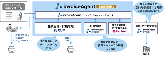 こうした課題に対し、「invoiceAgent Enterprise Cloud」は、大企業向けの統合帳票基盤サービスとして提供を開始します。本サービスは、日単位で数十万リクエストの帳票出力、数万ユーザーによる利用、数億ファイルの文書保管、さらに数十万件以上の受配信にスムーズに対応が可能です。