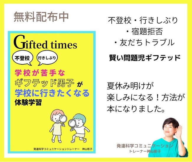 はじめまして 発達科学コミュニケーショントレーナー神山彰子です。ギフテッド男子の才能をごきげんで伸ばす専門家として活動しています。この度は、不登校や行きしぶりが多いギフテッド男子が夏休み明け学校に通いたくなる方法を解説した小冊子をリリースいたしました。