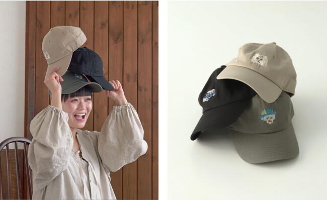 チャーミングなオリジナル刺繍をあしらったグッズ「トートバッグ」「キャップ」と、シーズンレスで着回せる「ワンピース」がラインナップ。刺繍は、小菅氏が手刺繍したモノを機械刺繍で忠実に再現。手刺繍ならではの糸の運びや立体感をそのままに表現されています。