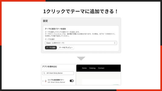 アプリをインストール後、1 クリックでストアへの追従画像バナーアプリブロックを追加できます。難しいコードの編集作業は一切必要ありません。この簡単な導入プロセスにより、技術的な知識がない方でも、プロフェッショナルな追従バナーをすぐに活用できます。さらに、テーマを変更した場合でも、再度1クリックで新しいテーマに追加できるため、将来的なテーマ変更にも柔軟に対応できます。時間と労力を大幅に節約しながら、効果的なマーケティングツールを手に入れることができます。