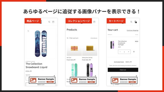 ホームページ、商品ページ、コレクションページなど、あらゆるページに対応した追従バナー表示