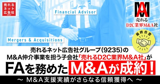 このような市場環境の中、売れるネット広告社グループが2024年2月に設立したM&A専門子会社「売れるD2C業界M&A社」は、D2C業界のみならず多様な業種に対応したM&A支援を展開し、今回の案件は同社にとって通算2件目となるM&A成約となります。