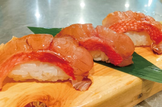 骨を抜いて炙った地金目鯛を、特製の漬けダレにくぐらせてから握ります。香ばしい炙りの風味と、タレの旨味が染み込んだねっとりとした身が、酢飯と絶妙にマッチします。