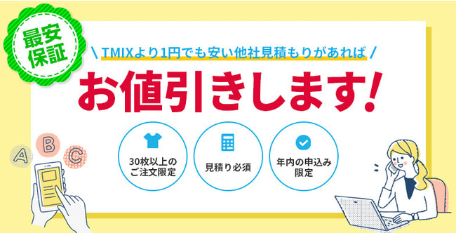 オリジナルTシャツをWeb上で1枚から作成できるサービスTMIX(ティーミックス)は、TMIXよりも1円でも安い他社のお見積り書を頂ければ、他社よりもお安い金額をご提案する「最安保証」キャンペーンを2022年内限定で開始いたします。