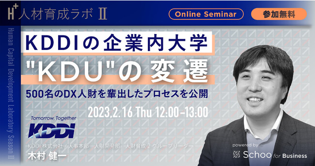 インターネットでの学びや教育を起点とした社会変革を行う株式会社Schoo(本社:東京都渋谷区、代表取締役社長CEO:森 健志郎、以下「スクー」)が提供する法人向け研修サービス「Schoo for Business」は、人的資本経営や組織開発に関連する情報発信やイベントを開催する「人材育成ラボ(H+)」を運営しています。この度2月16日(木)に、KDDI株式会社の人財開発部人財育成2グループリーダーを務める木村氏をお迎えし、同社が500名のDX人財を輩出した企業内大学「KDU(KDDI DX University)」の取り組みを紹介いただくウェビナーを開催します。参加費は無料です。