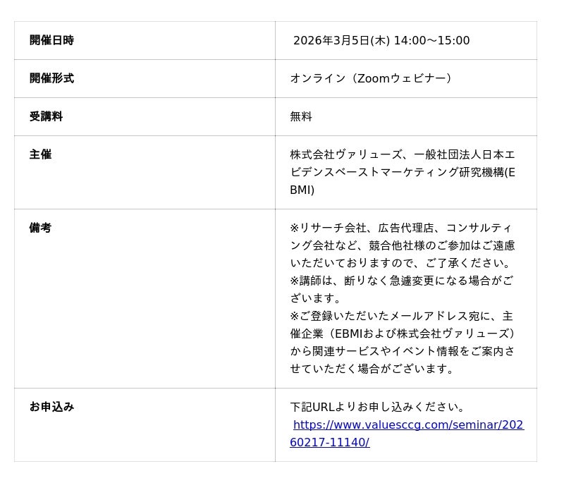 インターネット行動ログ分析によるマーケティング調査・コンサルティングサービスを提供する株式会社ヴァリューズ(本社:東京都港区、代表取締役社長:辻本 秀幸、以下「ヴァリューズ」)と一般社団法人日本エビデンスベーストマーケティング研究機構(代表理事:木田浩理、以下「EBMI」)は、2026年3月5日(木)に、無料オンラインセミナー「コンバージョンの獲得効率と強い相関を持つ『ブランド想起』の力とは」を共催いたします。
