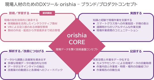 orishiaは、現場の「人」「情報」「技術」を"織りなす"という想いから生まれた、現場作業者向けDXソリューションブランドです。技術基盤コンセプト「orishia CORE」を中心に、現場作業のサイクルに合わせた4つの領域(習得/学習、実践、記録、解析)で製品群を構成しています。製造業のみならず現場を伴う全ての産業を対象としています。現場で発生する膨大なデータを、企業にとっての「資産」、作業者にとって価値のある「知恵」に変え、組織や現場の一人ひとりに最適なフィードバックを届けることで、その実行力を最大化します。