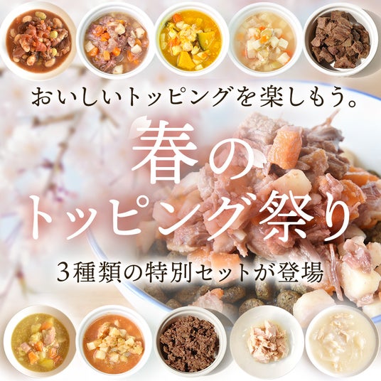 犬の好みに合わせて選びやすいよう、3つのセット「チキンセット」、「お魚セット」、「オールセット」をご用意しています。新しい一歩を踏み出す春の季節に、新しいトッピングを始めてみませんか?(いずれも数量限定品での提供となっており、なくなり次第販売終了となります。)