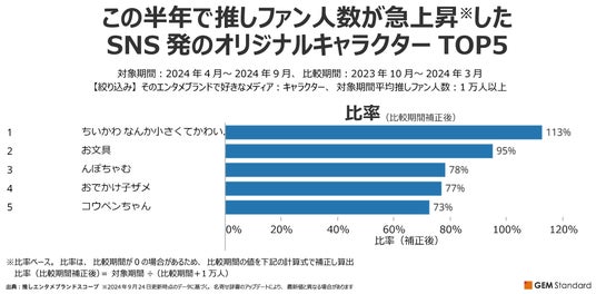 推しエンタメブランドスコープでは、アニメやマンガ、ゲーム等の作品に登場するキャラクターや、特定の企業、商品のマスコットとされるキャラクターではない、SNS投稿などを通じて人気を集めたオリジナルキャラクターも対象としています。今回、「推しエンタメブランドスコープ」を用いて、“SNS発のオリジナルキャラクター”について調べてみました。以下は、直近半年間とその前の半年間を比較し、比率ベースで推しファン人数が急上昇したSNS発のオリジナルキャラクターTOP5です。