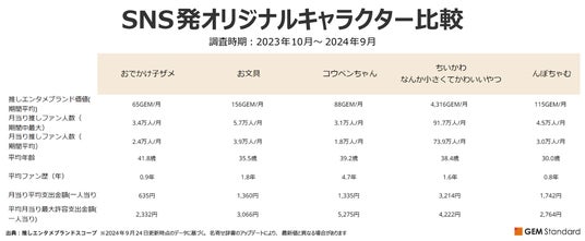 TOP5入りしたのは、『ちいかわ なんか小さくてかわいいやつ』(2020年、ナガノ)、『お文具』(2018年、お文具)、『んぽちゃむ』(2022年、可哀想に!)、『おでかけ子ザメ』(2021年、ペンギンボックス)、『コウペンちゃん』(2017年、るるてあ)※()内は誕生年、作者名。これらのオリジナルキャラクターについて、直近12カ月間の推しファンの特徴を比較してみます。