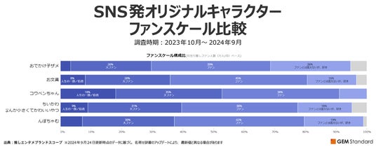 次にファンスケール構成比で比較してみます。「人生の一部/信者」と「大ファン」を含めた熱量の高いファン層の割合は、『コウペンちゃん』のみ50%を超えており、その他の4キャラクターでは40%以下となりました。『お文具』と『んぽちゃむ』はとても似通ったファンスケール構成比であることが分かります。『ちいかわ』もそれら2つにやや近い構成比と言えそうです。