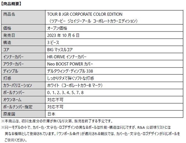 ブリヂストンスポーツ株式会社は、アマチュアゴルファーの飛距離の最大化を追求した ゴルフボール『TOUR B JGR』から、コーポレート「Bマーク」をあしらった、『TOUR B JGR CORPORATE COLOR EDITION』を10月6日より発売します。価格はオープンです。