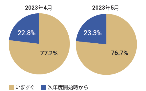 保育士バンク!の利用実績をもとに、当月の園の募集要件で、入職する タイミングが「いますぐ」なのか「次年度開始時」なのかの割合を算出、 前月と比較。