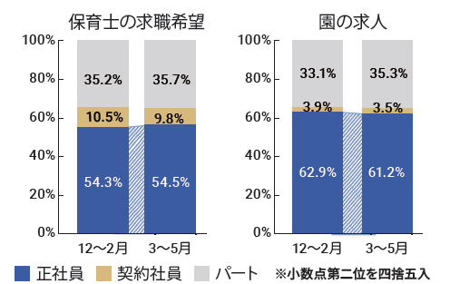 保育士バンク!の利用実績をもとに、直近3か月の保育士求職者の希望と園の募集要件で、正社員・契約社員・パートの雇用形態の割合を算出、 前期間と比較。