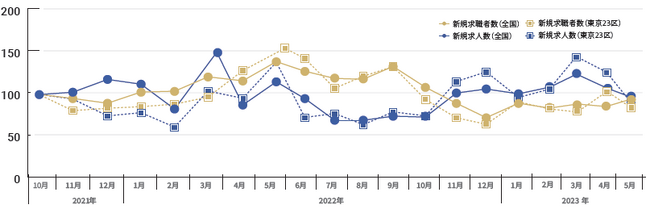 保育士バンク!の利用実績をもとに、月ごとの求職者数と保育園・幼稚園等の求人数の新規登録数実績を、時系列で算出。