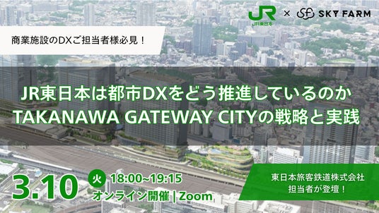 施設特化型モバイルオーダーシステムをはじめ商業施設DXの伴走支援を手がけるスカイファーム株式会社(本社:神奈川県横浜市 代表取締役:木村 拓也、以下「スカイファーム」)は、東日本旅客鉄道株式会社(本社:東京都渋谷区、代表取締役社長:喜㔟 陽一、以下「JR東日本」)の協力のもと、都市DXにおけるまちづくりの戦略と実践に関するオンラインセミナーを開催いたします。