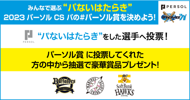 パシフィックリーグマーケティング株式会社(本社:東京都中央区、代表取締役CEO:根岸 友喜)は、2023年度パシフィック・リーグタイトルパートナーである総合人材サービスのパーソルホールディングス株式会社(本社:東京都港区、代表取締役社長 CEO:和田 孝雄)が「2023 パーソル クライマックスシリーズ パ」のパーソル賞をファン投票で決定し、抽選で豪華賞品が当たるキャンペーンを実施することをご案内いたします。