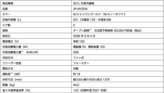 201L冷凍冷蔵庫(JR-MV20A)の概要は以下の通りです。