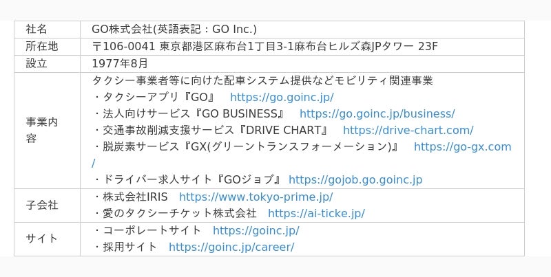 当社では、タクシー事業者とともにアプリドライバーの取り組みを、東京以外のエリア、神奈川・大阪・名古屋でも順次拡大予定です。当社が運営する求人サイト『GOジョブ』による全国のタクシー事業者への人材紹介も共に加速させ、全国のラストワンマイルの供給力向上へ貢献してまいります。