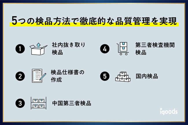 以上5つの検品方法のほか、当社はさらに工場の選定にもこだわっています。当社の協力工場監査基準を満たしている、且つ日本向け実績が豊富にある工場を選定し、品質重視の工場とのみ連携。また、安易に提携工場を増やさないことで品質を担保しています。