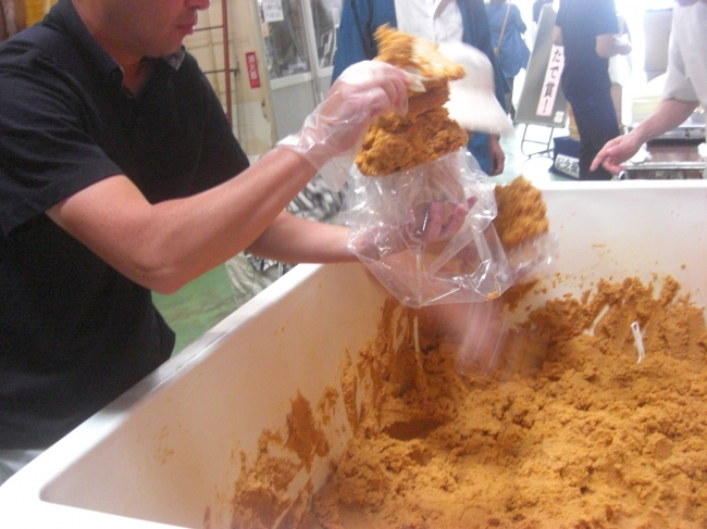 峰村醸造が年々減少する味噌を次の世代に醸して伝えられように企画したこのイベント。味噌の消費減少が叫ばれて久しい昨今に家族総出で味噌を盛る姿は圧巻です。地域の皆様が楽しそうに味噌を盛る!