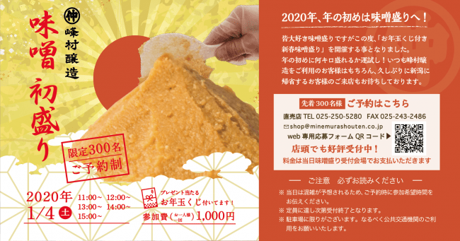 NSGグループの株式会社峰村商店は、2020年1月4日(土)、大人気の体験型イベント新春味噌盛り放題を開催いたします。祭りでは2万人が並ぶ大人気イベント!新潟で一番ユニークな味噌蔵の新春特別企画です!