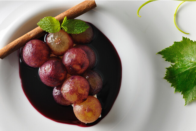メインのデザートは秋に旬をむかえるブドウを贅沢に味わえます。パンナコッタの上にブドウの粒を房についているブドウに見立ててあしらいます。パンナコッタにはファーム星野で生産したリコッタを使用。コクのあるリコッタはシナモンや柑橘類を煮込んだ赤ワインソースとの相性が抜群です。ブドウの甘味と味わい深い赤ワインソースを合わせて堪能できる大人なデザートです。
