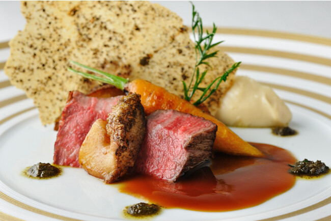 コースのメインには、牛フィレ肉と柔らかく煮た鮑のアローストを提供します。牛フィレ肉と鮑の食感のアクセントに、昆布を効かせたチップを用意。付け合わせには、秋に旬を迎えるキクイモのピューレ、ミニニンジンのローストと葉のフリットを添えます。また、ソースは2種類です。一方は、牛肉を昆布の出汁と鮑の蒸し汁で煮詰めたソースに、マルサラワイン(*3)を合わせます。もう一方は、鮑の肝に焦がしバターを加えたソースです。魚介の旨味や熟成感のあるマルサラワインの甘み、コクのあるほろ苦さが、牛フィレ肉と鮑の味わいをより一層引き立てます。