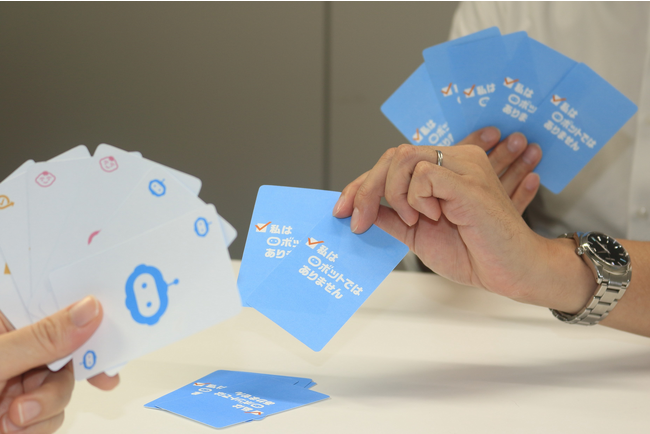 手元のカードを場に出す際には、「私はロボットではありません」と発言します。インターネット上での認証に用いられるこの言葉を、ゲームの一要素として組み込みました。真剣な声でも、ロボットっぽく言い換えても、どのように表現してもかまいません。この発言で相手を揺さぶるのも戦略です。