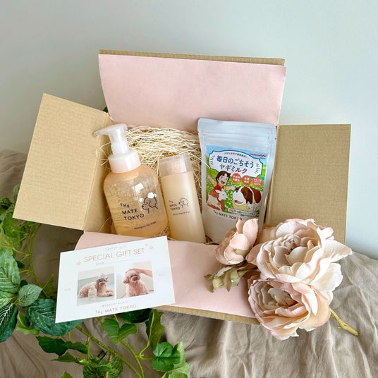 また、合わせてTHE MATE TOKYOの人気商品が詰まったギフトBOXを数量限定、特別料金で販売いたします。大切なご家族であるペットのことを考えて作られた、お肌に優しいケア用品、食品を可愛くラッピングしたセット商品です。是非、お得な機会にお試しください。