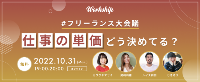 フリーランス・副業向けマッチングサービス『Workship(https://goworkship.com/)』を運営する株式会社GIGは、「みんなどうやって「仕事の単価」決めてる? #フリーランス大会議」と題し、フリーランスの仕事の探し方をテーマに無料ウェビナーを開催いたします。