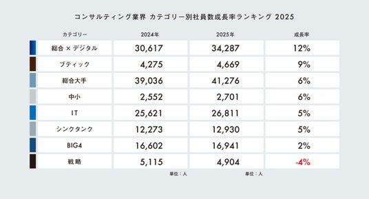 コンサルティング業界 カテゴリー別社員数成長率ランキング(表3)