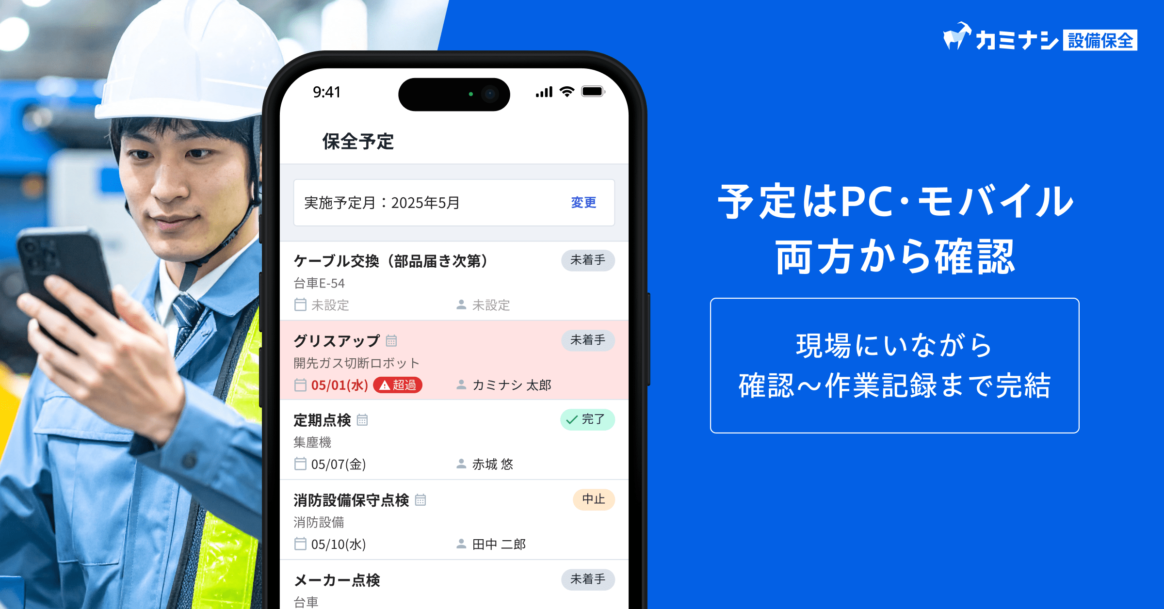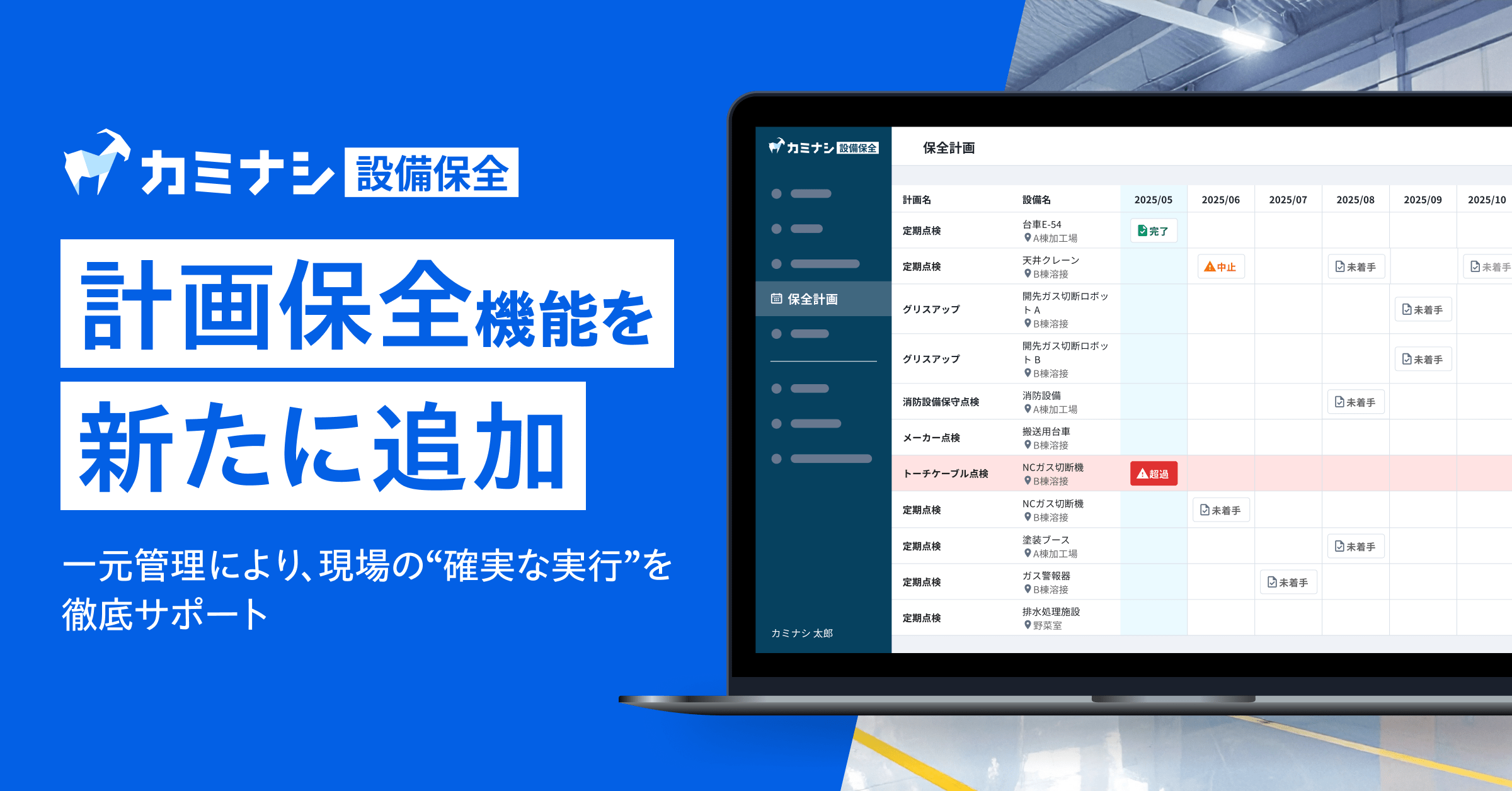 株式会社カミナシ(本社:東京都千代田区、代表取締役CEO:諸岡 裕人、以下「カミナシ」)は、設備の保全業務をデジタル化するクラウドサービス『カミナシ 設備保全』において、予防保全の計画作成から実行、スケジュール管理や通知を一元管理できる新機能「計画保全機能」を提供開始したことをお知らせします。