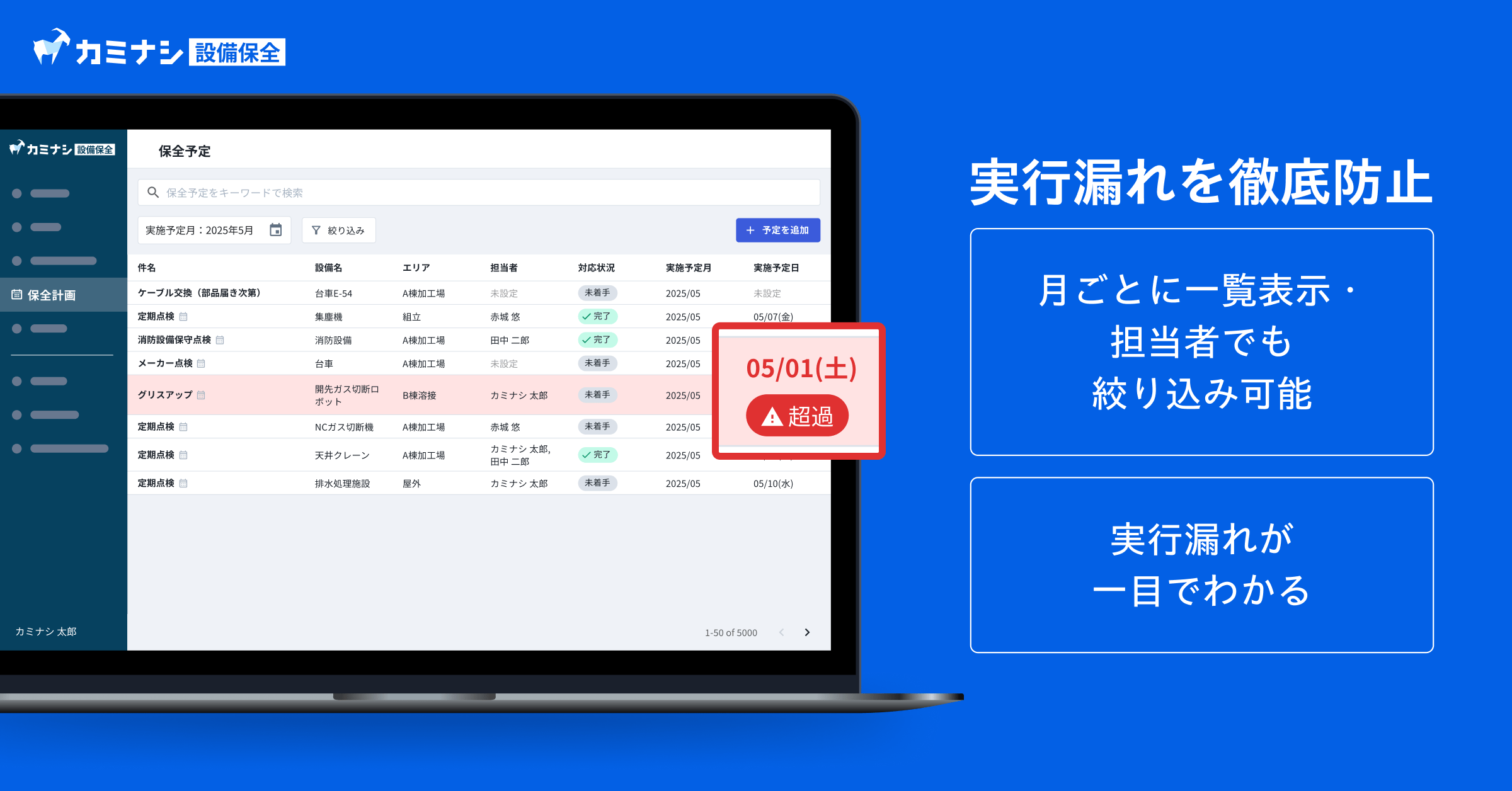 こうした課題を解決するため、『カミナシ 設備保全』では、新たに「計画保全機能」を開発しました。本機能は、予防保全業務における計画作成、アサイン、実行、記録までの一連の流れをデジタルで一元管理することで、「計画倒れ」や「実行漏れ」を防ぐことに重点を置いています。現場の実行性を高めることで、設備の安定稼働と生産性向上に貢献します。