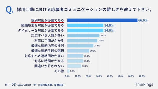 一方で、「採用活動における応募者とのコミュニケーションの難しさ」を聞いたところ、66%が「個別対応が必要」と回答しました。