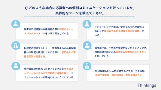 応募者と個別でコミュニケーションを取る具体的なシーンを聞いたところ、「個別のフィードバックやコメントをつけて案内している」ほか、「学生それぞれの興味に合わせて座談会や会社見学等を個別に調整している」「配属先の上長との面談を実施する」など学生のニーズに合わせた情報提供などの個別対応を行っていることがわかりました。